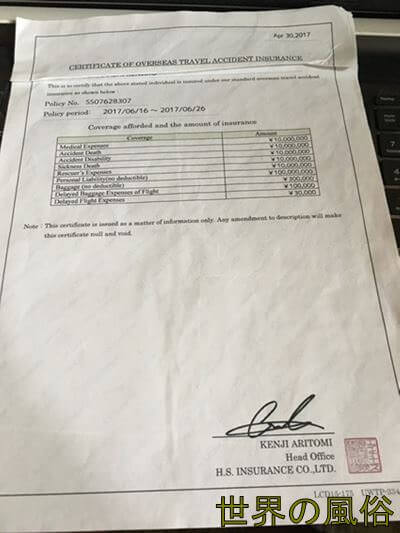 気を付けることが一点あります。アメリカとの関係がいまだにアレな状況なので、アメリカ資本の保険会社やクレジットカード付帯の保険証書はNGです。日系で普通に探すか、国際派の皆様は非アメリカの、例えばヨーロッパ資本などの保険会社で安く契約して、英文証書を受け取ってください。