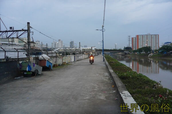 鉄道と川の間にはいくつかの小屋が立っています。まさに、じゃかるた新聞に載っていた通りの場所に「売春街ボンカラン」はあったのです。