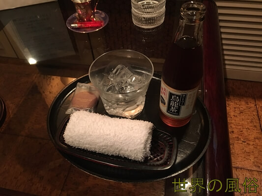 「飲み物は何になさいますか?」と、聞かれたので、とりあえずお茶を要望。しばらくすると、おしぼりとお茶と菓子がやってきました。