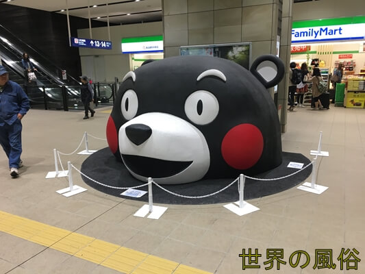 熊本駅に到着。くまもんのお出迎えです。九州には熊が居ないそうですが、くまもんで押す熊本ww