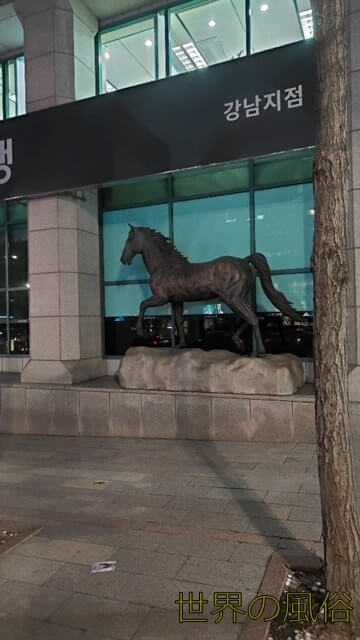 このお馬さんが右手に見えると、少しだけ行き過ぎです。30歩ほど戻ると、先ほどのビルが見えます。