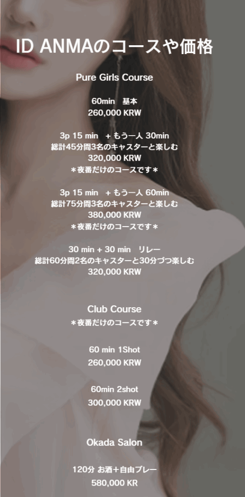 というのも、ピュアガールズコースで32万ウォン以上のコースだと3P15分がつくからです。他の按摩で3Pする場合、料金がもっと高いプランになってきますが、ID按摩ではノーマルの26万ウォンに少し足した32万ウォンで3Pできる点がお得ですからね。