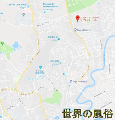 アウンミンガラーバスステーションはヤンゴン国際空港の北東にあります。