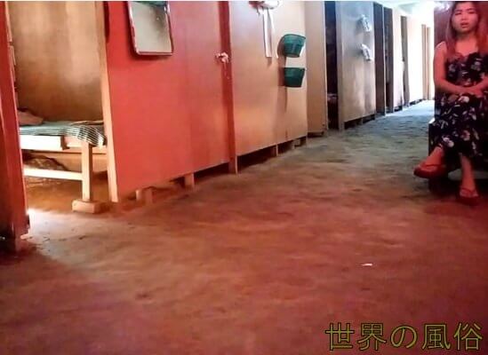 バイクが警笛を鳴らすと緑色の門が開き、バイクを降り、徒歩で10秒ほど先に小屋が見えてきました。中はやはりピンク色のネオンで、おじさんに呼ばれ5人程出てきます。