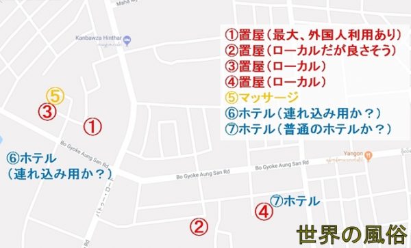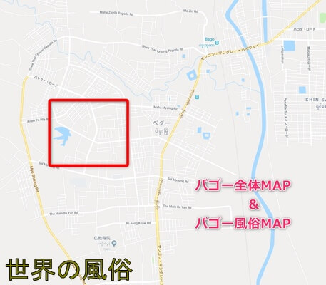 まずはバゴーの全体像を把握してください。上の地図全体でバゴー全体MAPです。赤色のところが置屋のあるバゴー風俗MAPです。