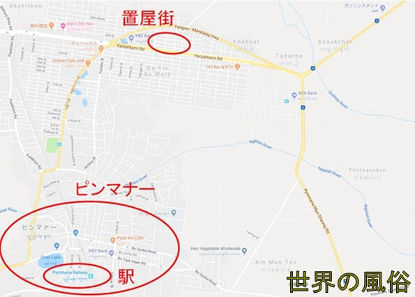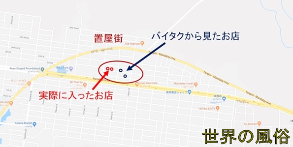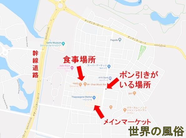 ポン引きがいる場所は、町の中心部にある「Thapyaygone Market」の北側です。