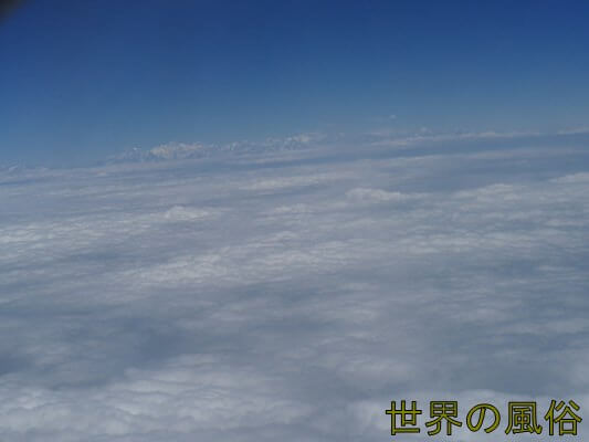 ネパール上空。飛行機は順調にカトマンズに向かっております。窓の外を見ると、雲の上に突き出した山々がみえます。さすがネパール。ヒマラヤ山脈のでかさに驚きます。雲の上に山が突き出している光景ってなかなか見ることできませんからね。
