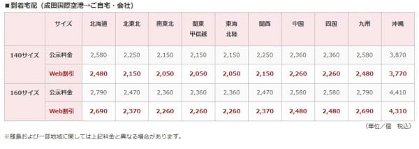 空港宅配でスーツケースを運んでもらうときの通常の料金表(成田の場合)は上記のとおり。本来なら2000円以上かかるはずの送料が毎回無料になるのはありがたいですね。