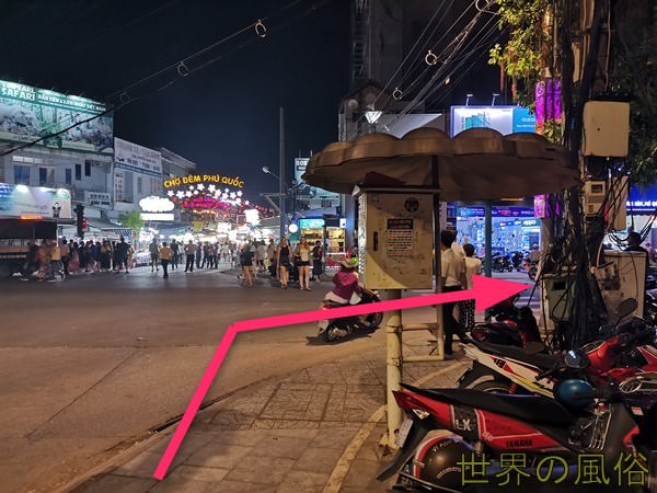 先程の写真にあるナイトマーケットの入り口をピンクの矢印通り右に曲がります。道なりに歩いていくと5分ほどで、フーコックのマッサージ置屋①Trường Anに到着します。