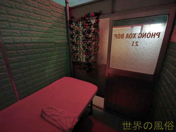 店の前に行くと、女の子が数名座っています。ベトナム語で「バオニューティエン?」と値段を聞くと、どのお店も30万ドンでした。